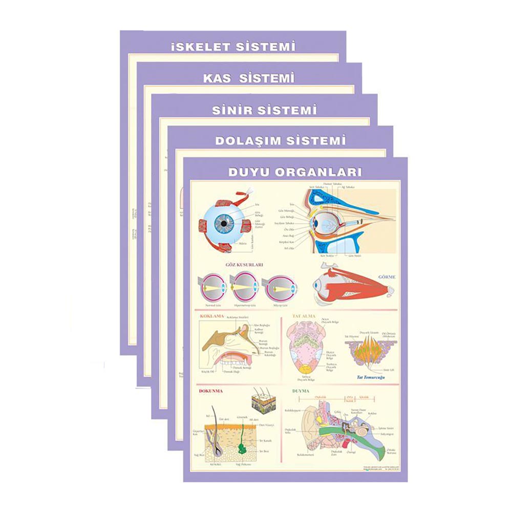 Set içerisinde yer alan dolaşım, iskelet, kas ve sinir sistemi levhaları, renkli çizim tekniğiyle tasarlanmış olup, görsel anlatımı güçlendirerek öğrencilerin konuları daha hızlı kavramasına yardımcı olur. Özellikle biyoloji ve fen bilgisi derslerinde, konu anlatımlarında ve laboratuvar ortamlarında öğretici kaynak olarak kullanılabilir.