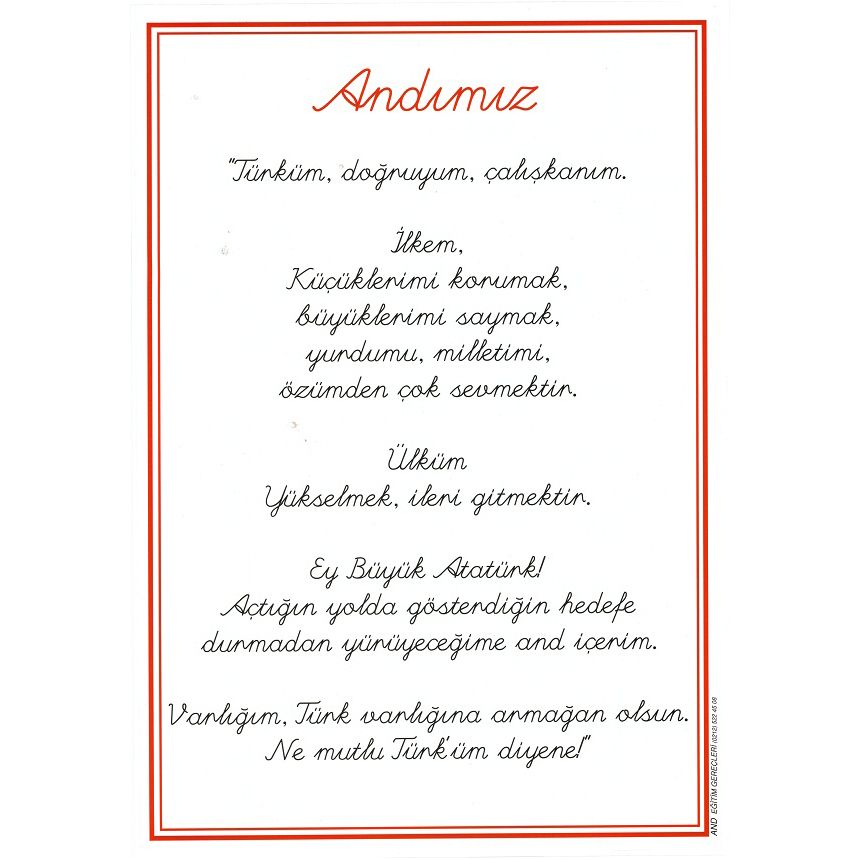 KDV Hariç: ₺30,00Andımız Panosu 35×50 cm, öğrencilerin Andımız’ı doğru, eksiksiz ve kalıcı şekilde öğrenmesini ve içselleştirmesini sağlamak amacıyla hazırlanmış, sade ve anlamlı bir sınıf materyalidir.