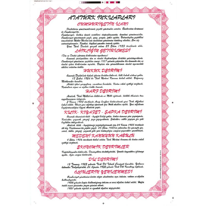 Pano üzerinde inkılaplar detaylı ve anlaşılır şekilde sunulmuş olup, öğrencilerin inkılapların tarihsel önemini ve toplumsal katkılarını kavramasını kolaylaştırır. Bu sayede, hem tarih derslerinde hem de sosyal bilgiler derslerinde görsel destek sağlar ve ders anlatımını daha etkili hale getirir.