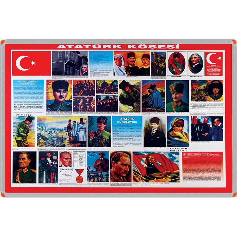 Atatürk Köşesi Panosu (Alüminyum Çerçeveli) 70×100 cm, Türkiye Cumhuriyeti’nin kurucusu Mustafa Kemal Atatürk’ün hayatını ve başarılarını tarihsel bir akış içinde anlatan, bilgilendirici ve saygı dolu bir eğitim materyalidir.