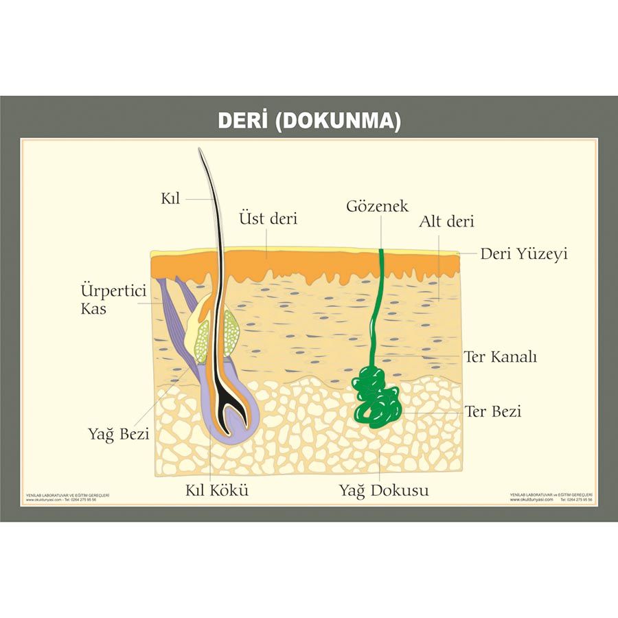 Levha üzerinde derinin tabakaları, kıl dokusu, ter bezi ve diğer yapısal unsurlar açık ve anlaşılır şekilde gösterilmiştir. Böylece öğrenciler, dokunma duyusunun nasıl çalıştığını ve derinin vücuttaki görevlerini net bir şekilde kavrayabilir.