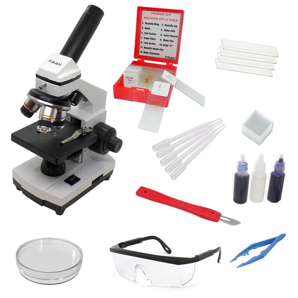 Set içerisinde ayrıca mikroskop kullanımı için gereken tüm malzemeler yer alır; hazır preparatlar, lamlar, lameller, boyalar, petri kapları, bistüri, pens, pastör pipet, parmak kan alma iğnesi ve koruyucu gözlük gibi araçlar sayesinde kapsamlı bir mikroskobik çalışma ortamı sağlanır.