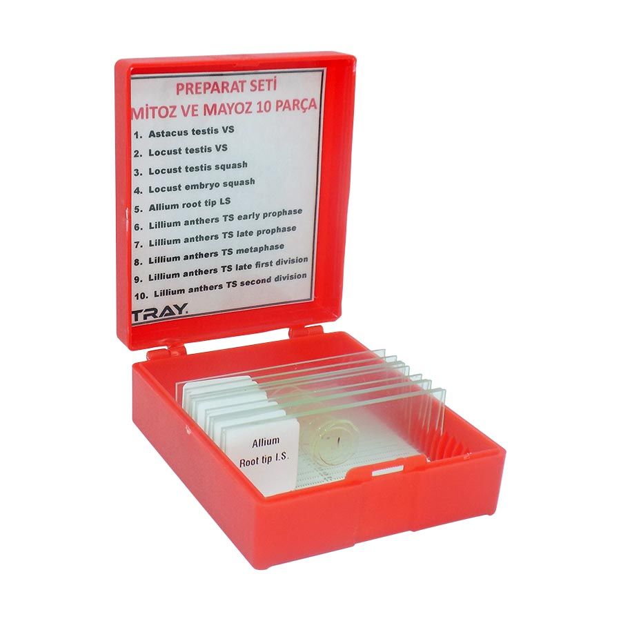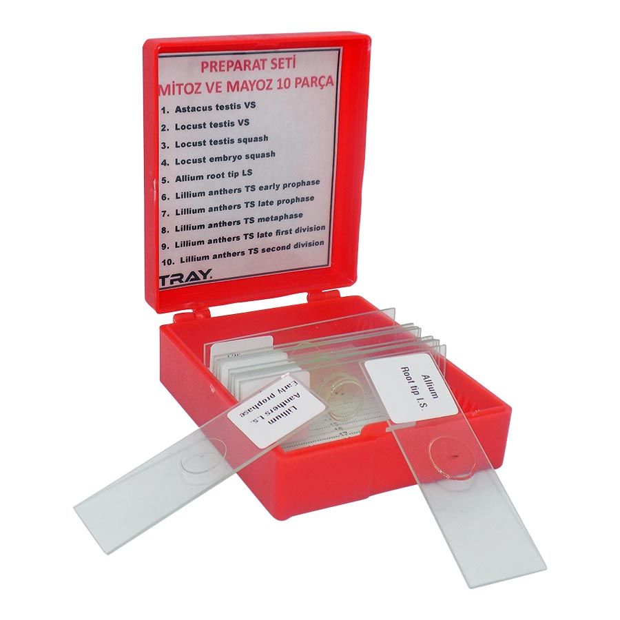 Set içerisinde yer alan 10 adet hazır preparat, hücre bölünmesinin farklı evrelerini detaylı şekilde gösterir. Plastik taşıma kutusu, slaytların güvenli şekilde saklanmasını ve taşınmasını sağlar. Özellikle biyoloji laboratuvarlarında, öğrencilere hücre döngüsü, kromozom davranışı ve bölünme mekanizmaları hakkında uygulamalı eğitim imkânı sunar.